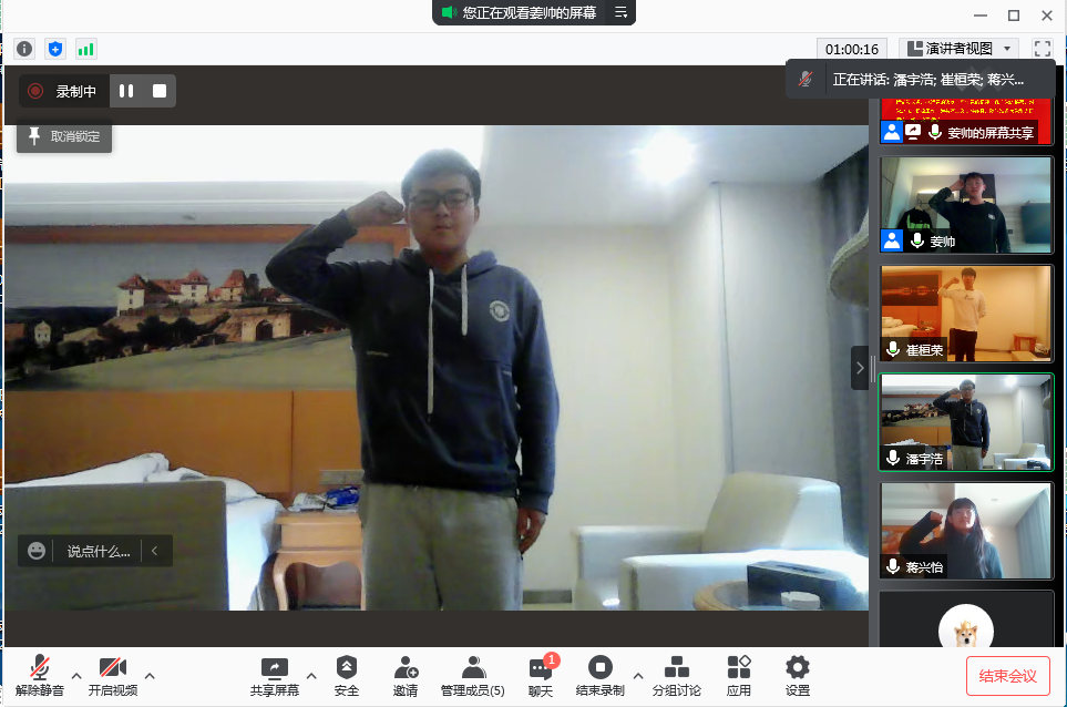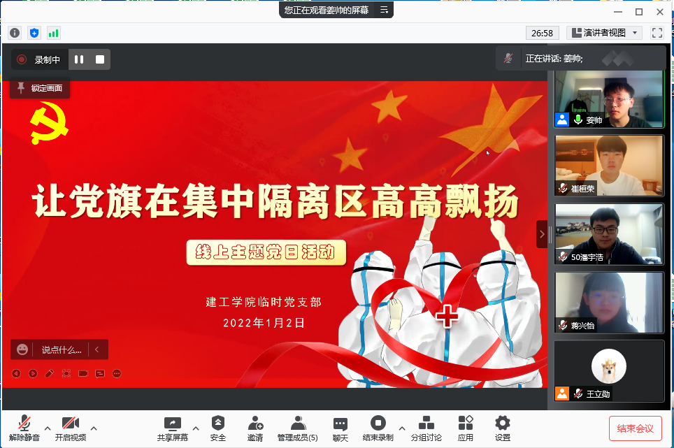 2022年1月1日, 欧美AV 党委决定在汉庭优佳酒店隔离的学生党员中成立 欧美AV 隔离区临时党支部。1月2日 欧美AV 隔离区临时党支部全体党员相聚云端,召开了一次特殊的线上主题党日活动。活动通过腾讯会议召开,由临时党支部书记姜帅主持,支部成员崔桓荣、蒋兴怡、潘宇浩参加了活动。