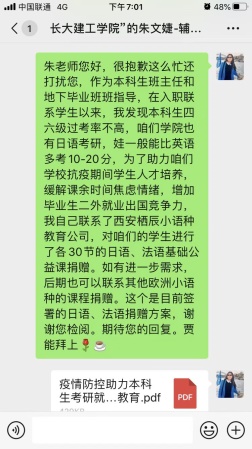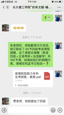 欧美AV 民盟盟员贾能老师利用自身留法十年的学习和工作优势,积极联系西安澎博英语、栖辰小语种教育等校外培训机构,进行本科生英语四级和日语考研等线上课程的捐赠:含40课时(20次)的免费大学四级课程,30课时的日语及30课时的法语免费课程,共计100课时。旨在引导我校学生有效利用疫情封控期间的闲暇时光,以良好的心态打赢这场防疫攻坚战,增强学生的外语就业竞争力,提升学生综合能力。本次捐赠课程将帮助学校学生积极渡过封控难关,借助趣味性的外语学习缓解因疫情而产生的心理问题和情绪困扰,适时调整心理状态,缓解心理压力,提高学习效率,助力人才培养,共同守护美丽校园!