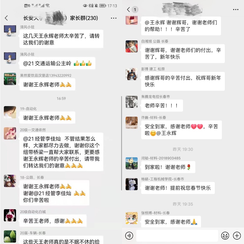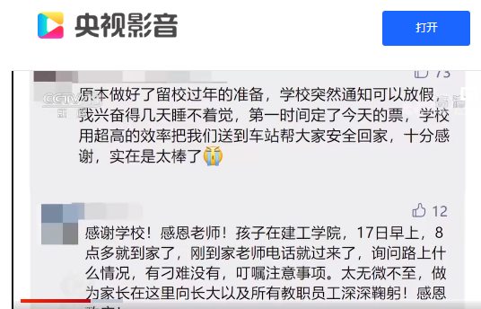 1月22日,央视《焦点访谈》节目以“‘疏’‘堵’结合保春运”为题播出了学校为保障学生安全返乡做出的努力。欧美AV学生家长在节目下面留言:“感谢学校!感谢老师!孩子在 欧美AV ,17日早上8点多就到家了,刚到家接到老师电话,询问路上什么情况,有刁难没有,叮嘱注意事项,太无微不至,作为家长在这里向长大以及所有教职工深深鞠躬!感谢!”相信这位家长的一番话是所有家长心情的缩影,也是对所有为学生返乡做出贡献的老师最大的鼓励。