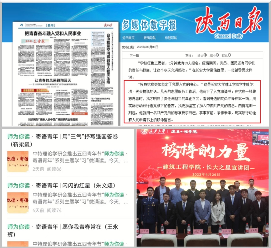 优化网络宣传,彰显青年风貌。欧美AV 团委依托“长大建工立业”“ 欧美AV 研究生”和“长大建工学研会”微信公众号优化欧美AV 团学新媒体矩阵,统筹开展宣传文化工作,展现青年、感染青年、引领青年。用心培育选树青年典型,积极开展“榜样力量 长大之星”宣讲活动,在公众号连续推送8期“建工榜样”专题推文,累计3300余人阅读转发,2020级学生吐尔洪·买买提的青年抗疫事迹受到《陕西日报》宣传报道;在微信公众号开设系列专题专栏,本学期累计推送“青学青思”专题推文43期、“师为你读”专题推文9期、“学‘习’微诵读”专题推文15期、“庆祝建团百年”专题推文11期,深入学习宣传贯彻习近平新时代中国特色社会主义思想,引导和动员广大青年铭记党的关怀,向榜样学习。