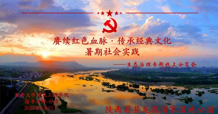 实践队员在以“调研生态治理”为主题的分享中,从地理位置、建设背景两方面,依次讲解陕西眉县龙源国家级湿地公园、天汉湿地公园、亚洲艺术公园三个案例。指导老师白涛勉励实践队员要聚焦主责主业,充分发挥本专业在社会建设和生态建设当中的作用,“打铁还需自身硬”,只有将专业知识学好,才能在第二个百年奋斗的新征程中贡献当代青年的青春力量。