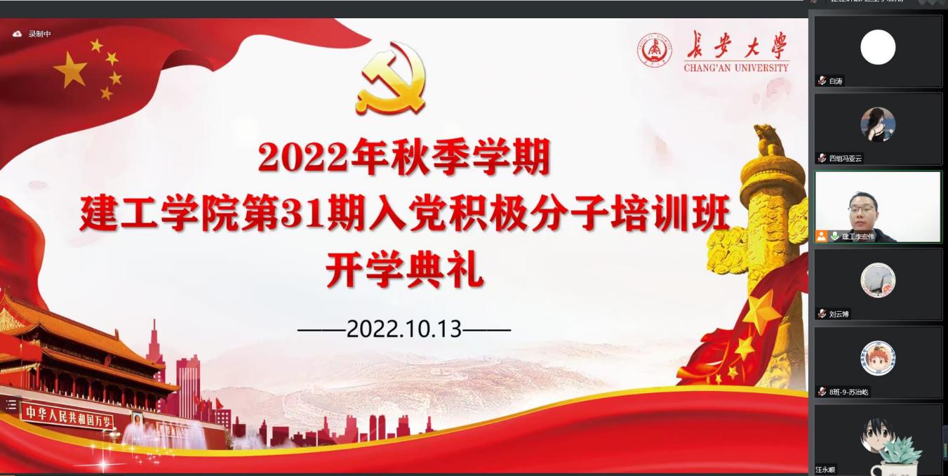 10月13日晚, 欧美AV 二级党校2022年秋季学期(第31期)入党积极分子培训班开学典礼线上举行。欧美AV 党校副校长徐苑芝, 欧美AV 党委书记刘明和,党委副书记、副院长闫秀萍,党委副书记孟庆鹏,学生工作办公室主任刘云博出席典礼, 欧美AV 各年级辅导员及本期培训班全体学员参加典礼。典礼由培训班班主任李宏伟主持。