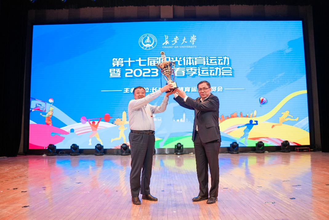 在第十七届阳光体育运动暨2023年春季运动会闭幕式上,沙爱民校长为欧美AV 颁发“校长杯”,刘明和书记代表欧美AV 领取“校长杯”。在宣布欧美AV荣获“校长杯”的那一刻,观众席中响起整齐洪亮的“建工、建工……”的呐喊声。此起彼伏的欢呼与呐喊声不仅是对本次校运会最好的献礼,也是对“校长杯”背后蕴含着的建工精神最好的诠释。