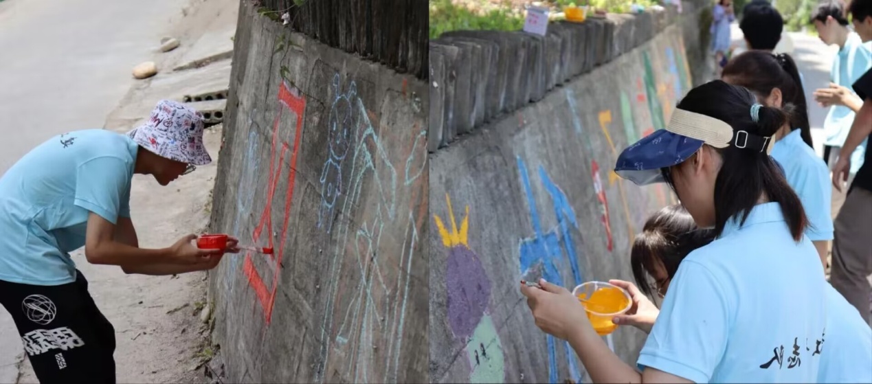 梭椤村依靠当地丰富自然资源大力发展旅游业,在村民钱包鼓起来以后,村委会便琢磨如何让村民乡风立起来。为此,村委会在村中心打造了“梭椤村亲子休闲区”,利用废旧木材搭建趣味休闲器材。实践队了解到该“休闲区”刚好缺少一面体现梭椤特色的彩绘壁画,便自告奋勇接下了这个任务,与村民一起共绘趣味壁画。在清理墙壁上的灰尘后,实践队员一笔一划、苍劲有力地写下“梭椤村亲子休闲区”八个大字,实践队员还绘制了各类卡通形象,增加了墙面的趣味性。队员手动制作了“我想见你不远万里”“千年古梭椤”等指示牌,进一步美化梭椤村路边装饰,为梭椤村增添了人文气息。