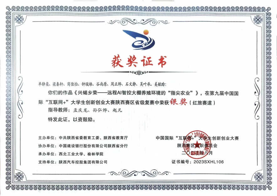 同时,通过组织师生共同参与蝎子智慧养殖项目,既提升了学生科研实践能力,又强化了学生在乡村振兴大舞台中贡献“小我”的使命担当。在2023年中国国际“互联网+”大学生创新创业大赛中,孟庆龙指导的《兴蝎乡荣——远程AI智控大棚养殖环境的“指尖农业”》获得红旅赛道省级银奖的好成绩。让学生在乡村振兴的实践中,探求人工智能技术落地应用的“真学问”,解决“真问题”,结合自身专业和学科,力求把论文写在祖国大地,把课题做到田间地头。