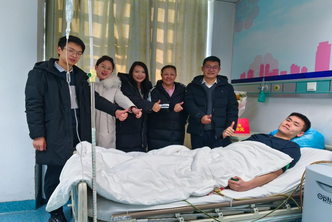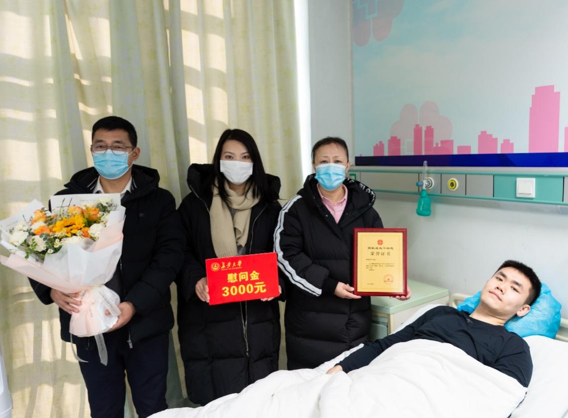 同日上午,校团委和 欧美AV 相关负责人一行前往唐都医院看望慰问了张凯军,对他乐于助人、无私奉献的高尚品质和爱心善举给予了高度赞扬和充分肯定,并代表学校、欧美AV 送上荣誉证书及慰问品。陕西省红十字协会相关负责人向张凯军同学颁发了“捐献造血干细胞”奖牌和“爱心使者”荣誉证书。