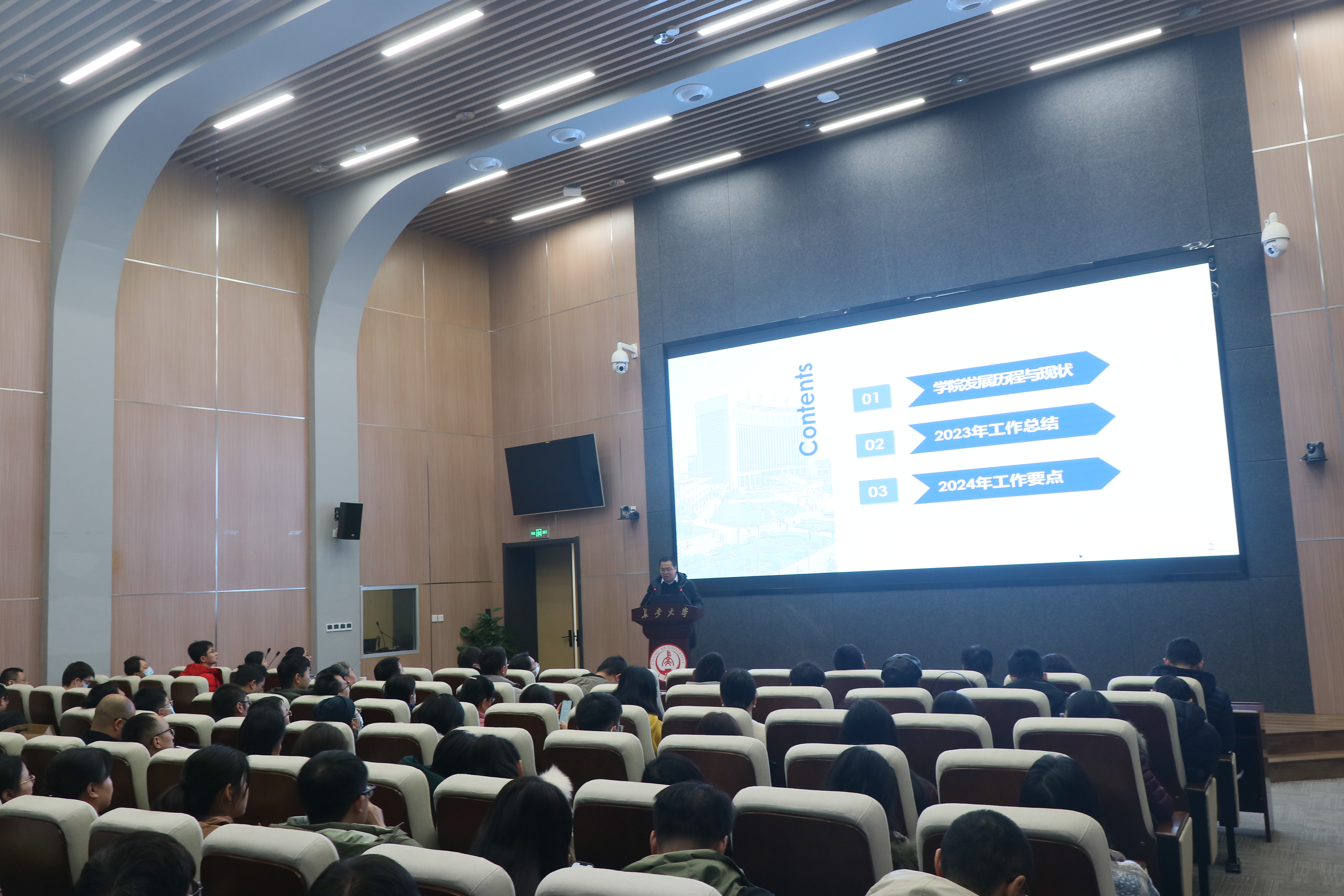 1月15日上午, 欧美AV 在北校区师生服务大厅第二报告厅召开全体教职工大会,宣布新一届欧美AV 主要领导干部的任命,总结2023年工作,布置2024年工作要点。副校长陈建勋出席会议,全体教职工参加会议,会议由欧美AV 院长邢国华主持。