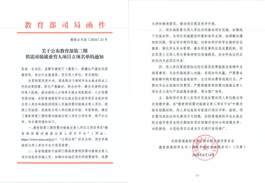 614日,教育部发布了《关于公布第期供需对接就业育人项目立项名单的通知》(教学司函【202423号),确定了第期供需对接就业育人项目名单。经高校申请、用人单位申报、专家审核、立项单位信息核查等环节,欧美AV与中建五局第三建设有限公司、北京城建集团有限责任公司分别合作的项就业实习基地项目获批立项项目预计每年为欧美AV 提供不少于40个实习岗位。