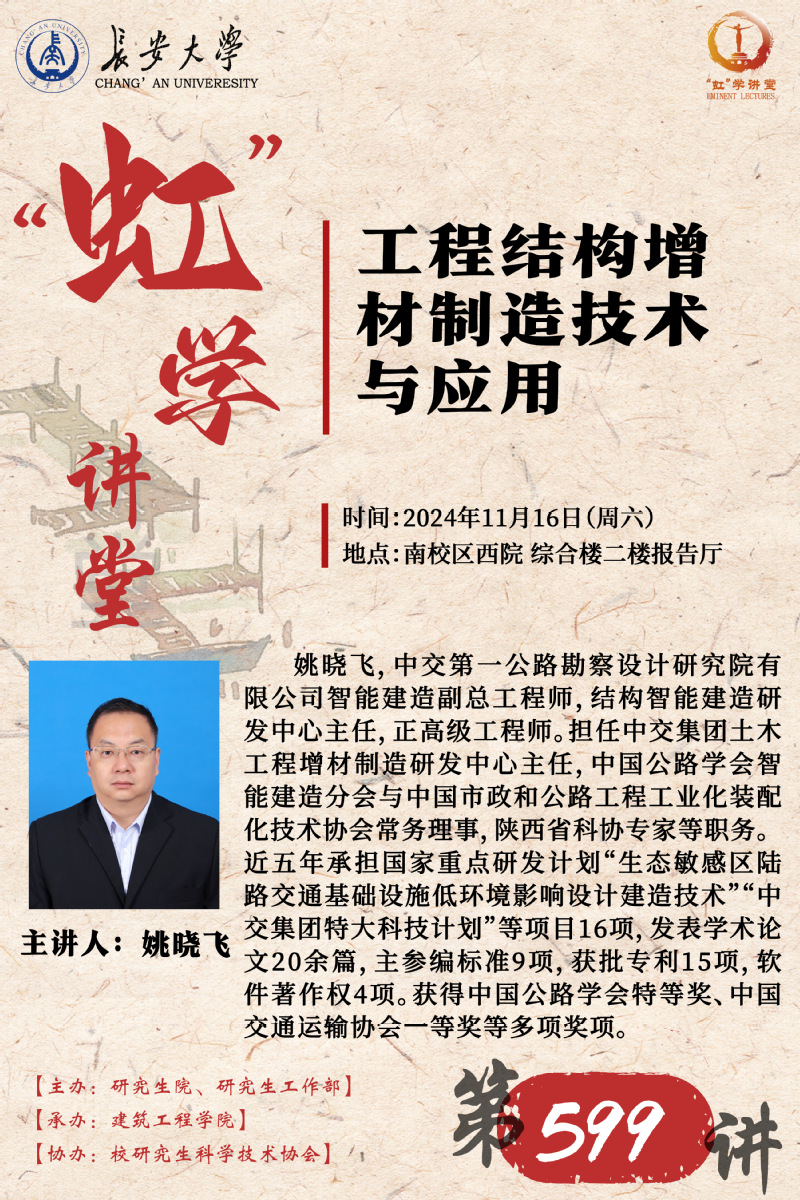姚晓飞,工学博士(后),中交第一公路勘察设计研究院有限公司智能建造副总工程师,结构智能建造研发中心主任,正高级工程师。同时担任中交集团土木工程增材制造研发中心主任,西安市混凝土结构3D打印智能建造工程技术研究中心主任,西安市桥梁工业化智能建造工程技术研究中心主任,陕西省工程结构3D打印技术产业集成与共享平台负责人,北京工业大学、欧美AV 等校外博硕士研究生导师,中国公路学会智能建造分会常务理事,中国市政和公路工程工业化装配化技术协会常务理事,中国混凝土3D打印协会理事,中国混凝土与水泥制品协会固废3D打印分会学术委员,陕西省科协专家。近五年承担国家重点研发计划“生态敏感区陆路交通基础设施低环境影响设计建造技术”“中交集团特大科技计划“工程结构原位3D打印关键技术及装备研究“等课题16项。获得中国公路学会特等奖1项、一二等 奖4项,陕西省勘察设计协会一等奖1项,中国交通运输协会一等奖1项,发表论文二十多篇,主参编标准9项,获批专利15项,软件著作权4项。