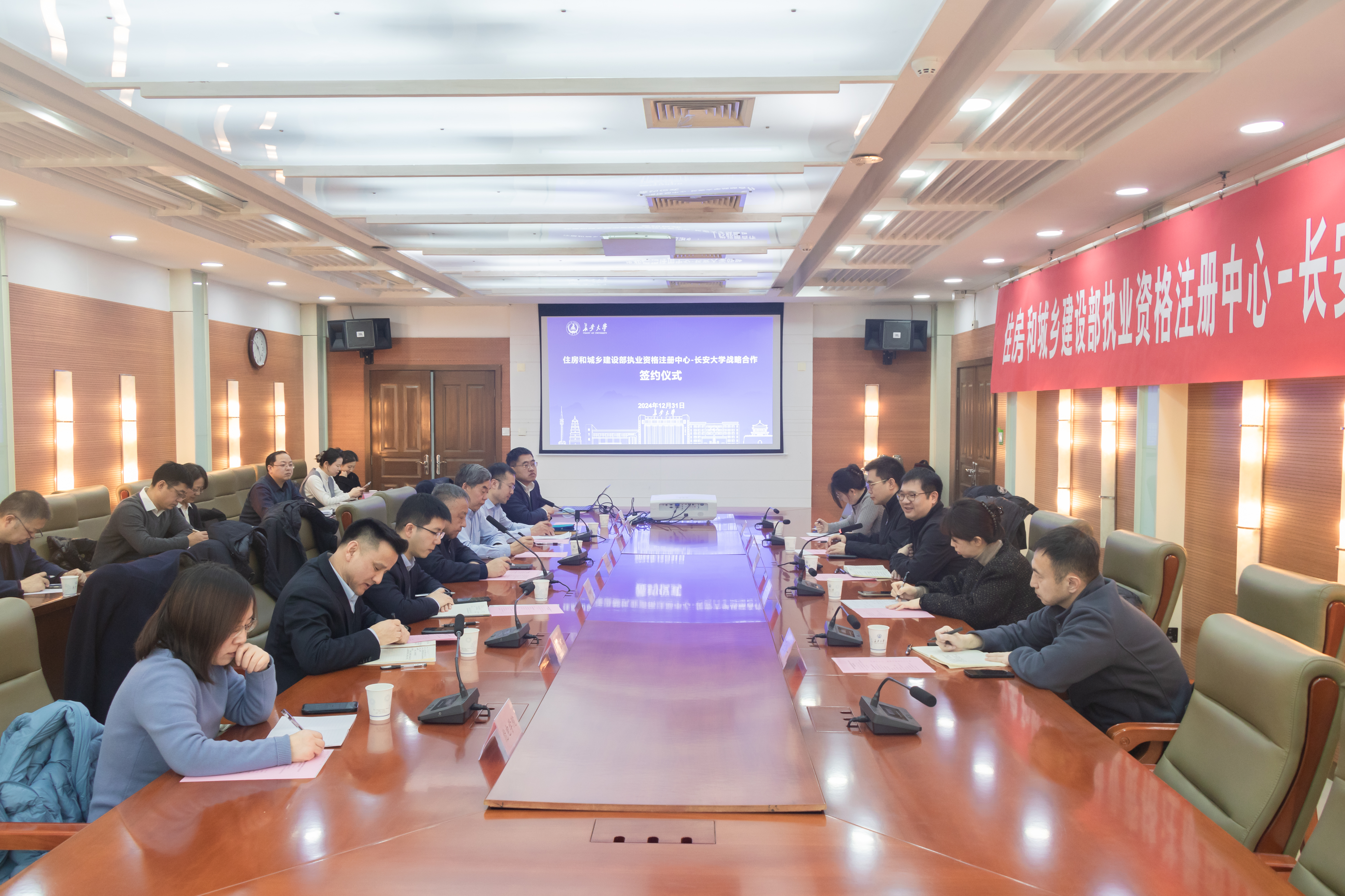1231上午,学校与住房和城乡建设部执业资格注册中心在北校区北辰楼会议中心第二会议室举行战略合作签约仪式。住房和城乡建设部执业资格注册中心副主任倪稞、副校长陈建勋、原副校长赵均海出席签约仪式。签约仪式由赵现伟主持。