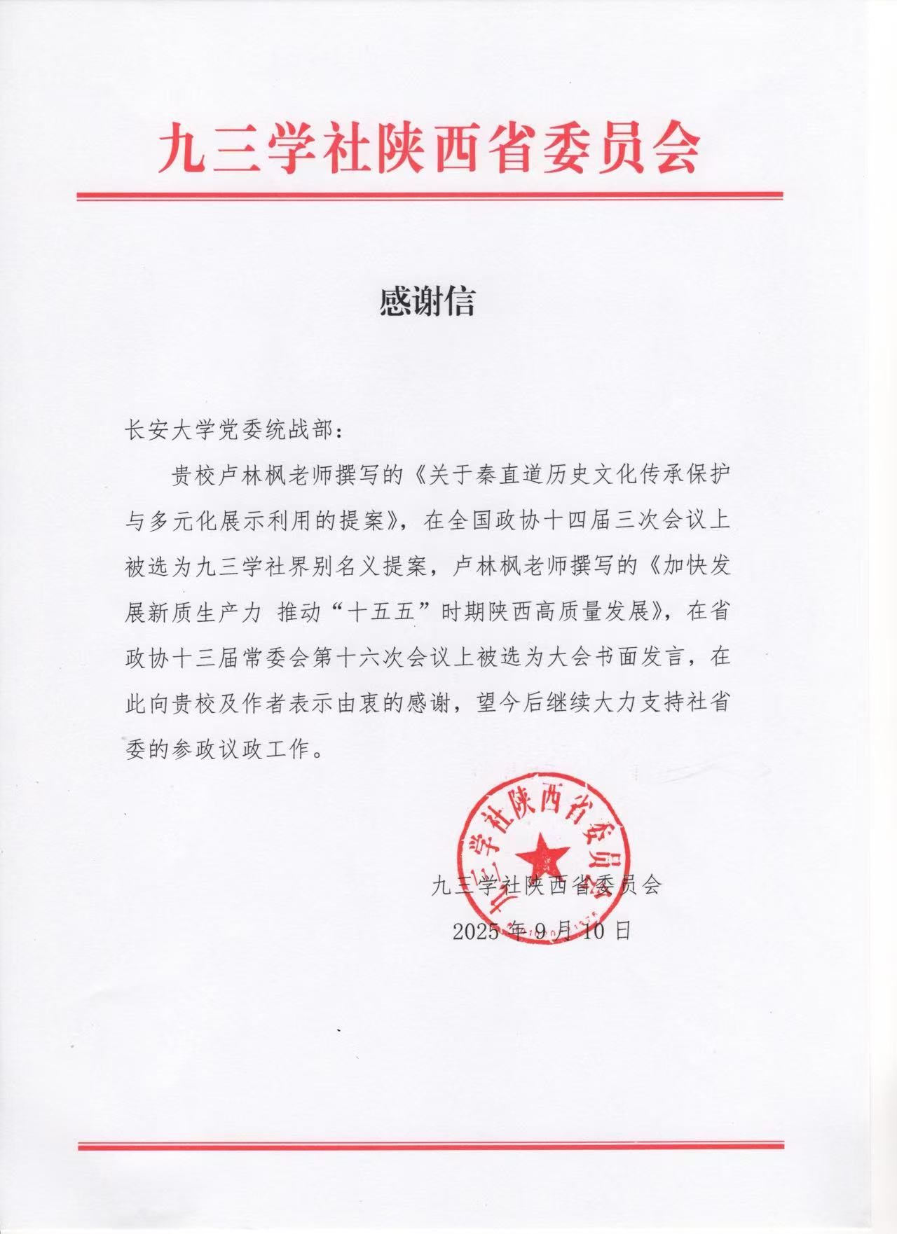 卢林枫教授撰写的《关于秦直道历史文化传承保护与多元化展示利用的提案》,在全国政协十四届三次会议上被选为九三学社界别名义提案,撰写的《加快发展新质生产力 推动“十五五”时期陕西高质量发展》,在省政协十三届常委会第十六次会议上被选为大会书面发言。在九三学社陕西省委员会致欧美AV 党委统战部的感谢信中,向欧美AV 及卢林枫教授表达了由衷感谢,并希望未来能继续支持社省委的参政议政工作。