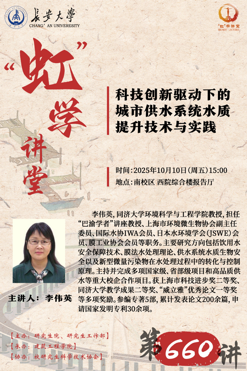 李伟英,同济大学环境科学与 欧美AV 教授,担任“巴渝学者”讲座教授、上海市环境微生物协会副主任委员、国际水协IWA会员、日本水环境学会(ISWE)会员、膜工业协会会员等职务。主要研究方向包括饮用水安全保障技术、膜法水处理理论、供水系统水质生物安全以及新型微量污染物在水处理过程中的转化与控制原理。主持并完成多项国家级、省部级项日和高品质供水等重大校企合作项目。获上海市科技进步奖二等奖、同济大学教学成果二等奖、“威立雅”优秀论文一等奖等多项奖励。参编专著5部,累计发表论文200余篇,申请国家发明专利30余项。