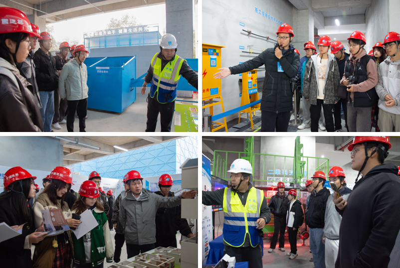 在项目现场,负责人带领师生共同参观项目一期施工区域,并详细讲解多项智慧建造技术的实际应用。同学们先后参观了数智建造协同平台、智能塔机操作室、建造全过程碳排放动态监测与四级分析平台、模块化集成建筑设计以及焊接机器人等自动化设备应用情况。这些前沿技术从环保、效率、工艺等多个维度,展现了现代建筑工业的科技内涵,让同学们对智慧建造有了具象化的理解。